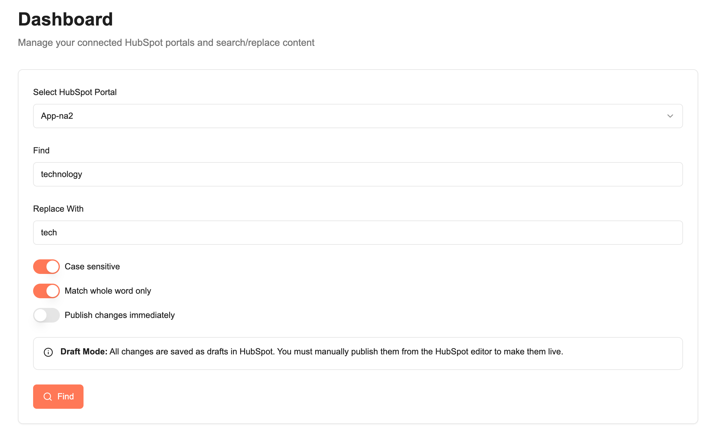 All replacements are saved as drafts in HubSpot. Nothing is auto-published. You maintain full control to review changes in HubSpot before publishing them live.